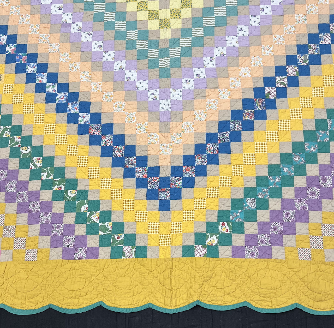 In Excellent Condition, the quilt is large enough to work with on a modern bed; it measures a generous 80 x 92 inches. The scalloped edge frames the cheery border, hand quilted in cables. . The display and range of the printed fabrics in the thousands of small squares is impressive ... and fun.