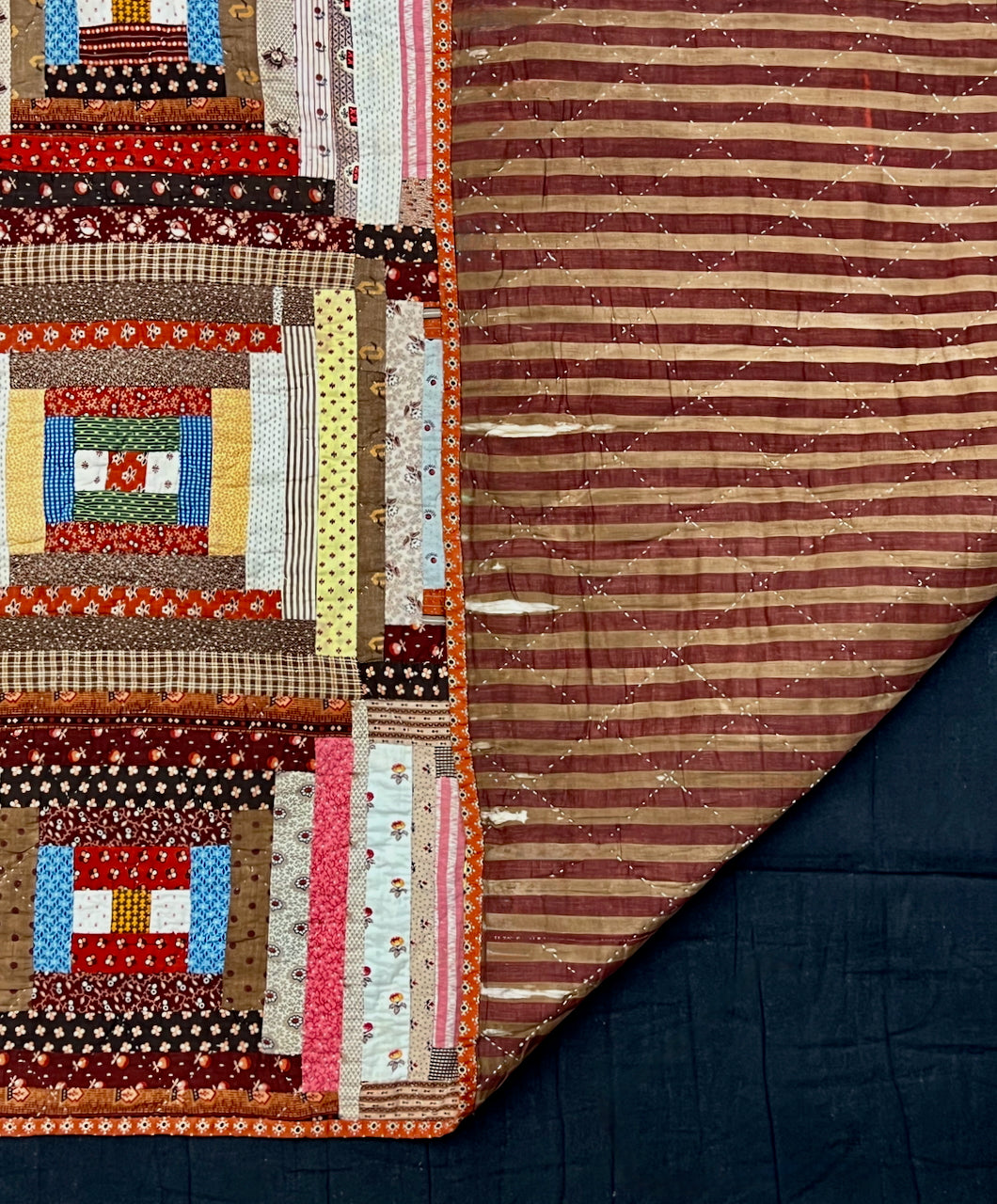 First, the Good News:  This gorgeous front of this  Log Cabin quilt (Light and Dark Variation) is in perfect condition! Check out the range of late 19th century cotton prints, organized in an appealing balanced way.