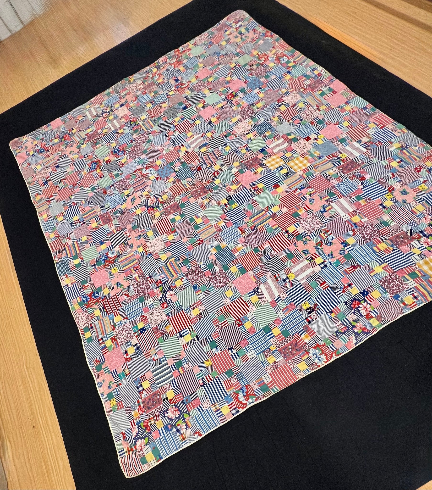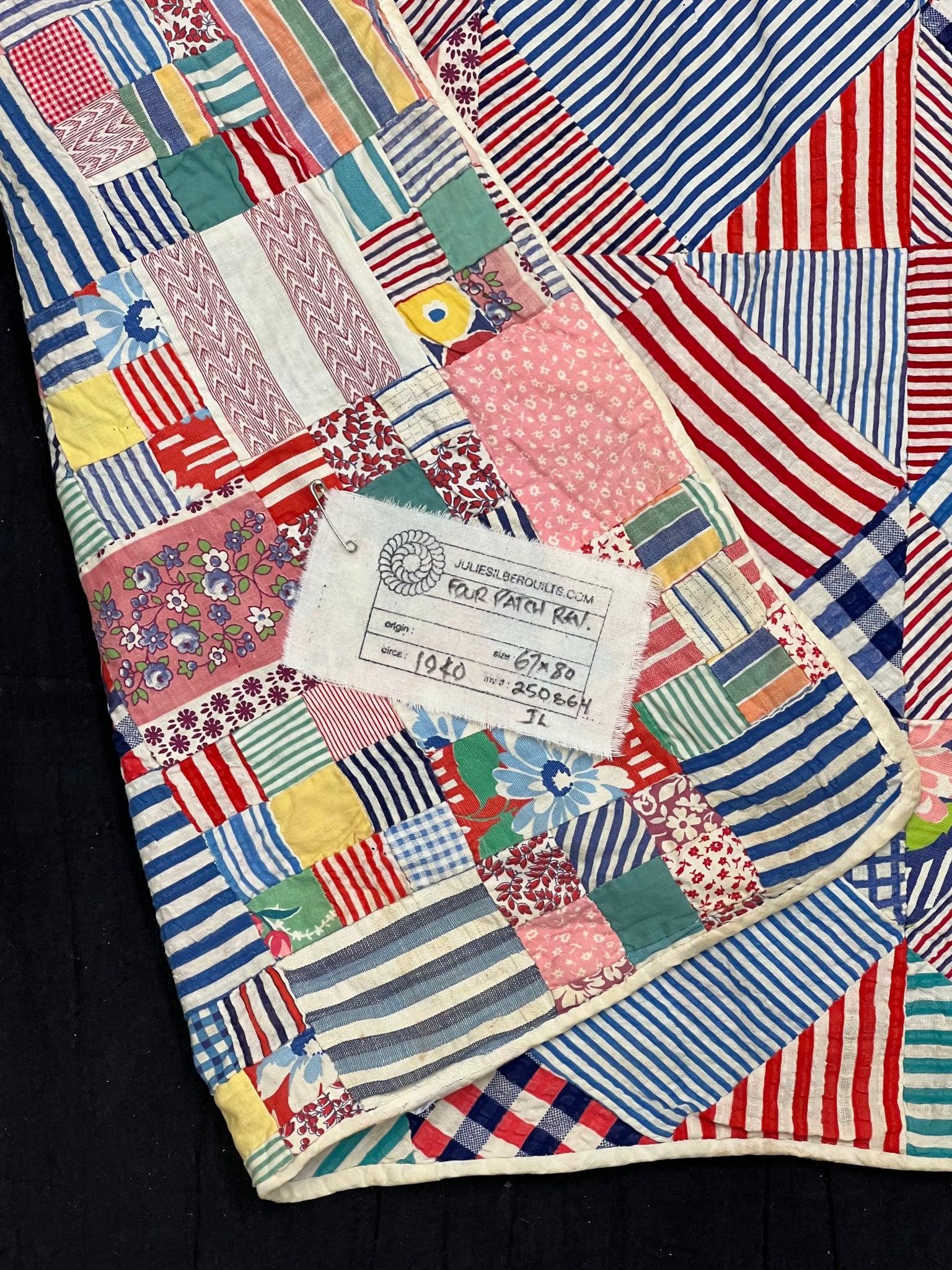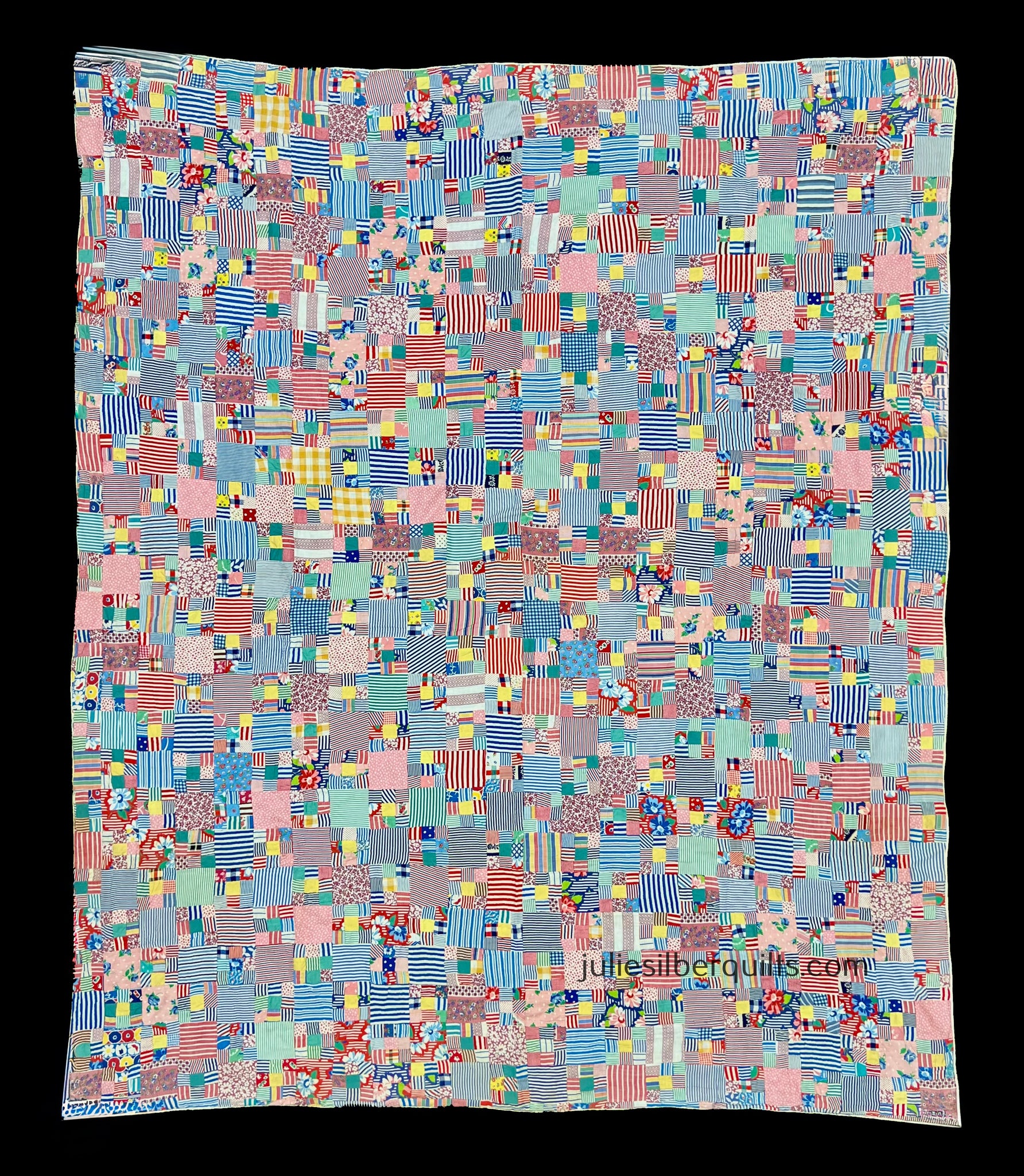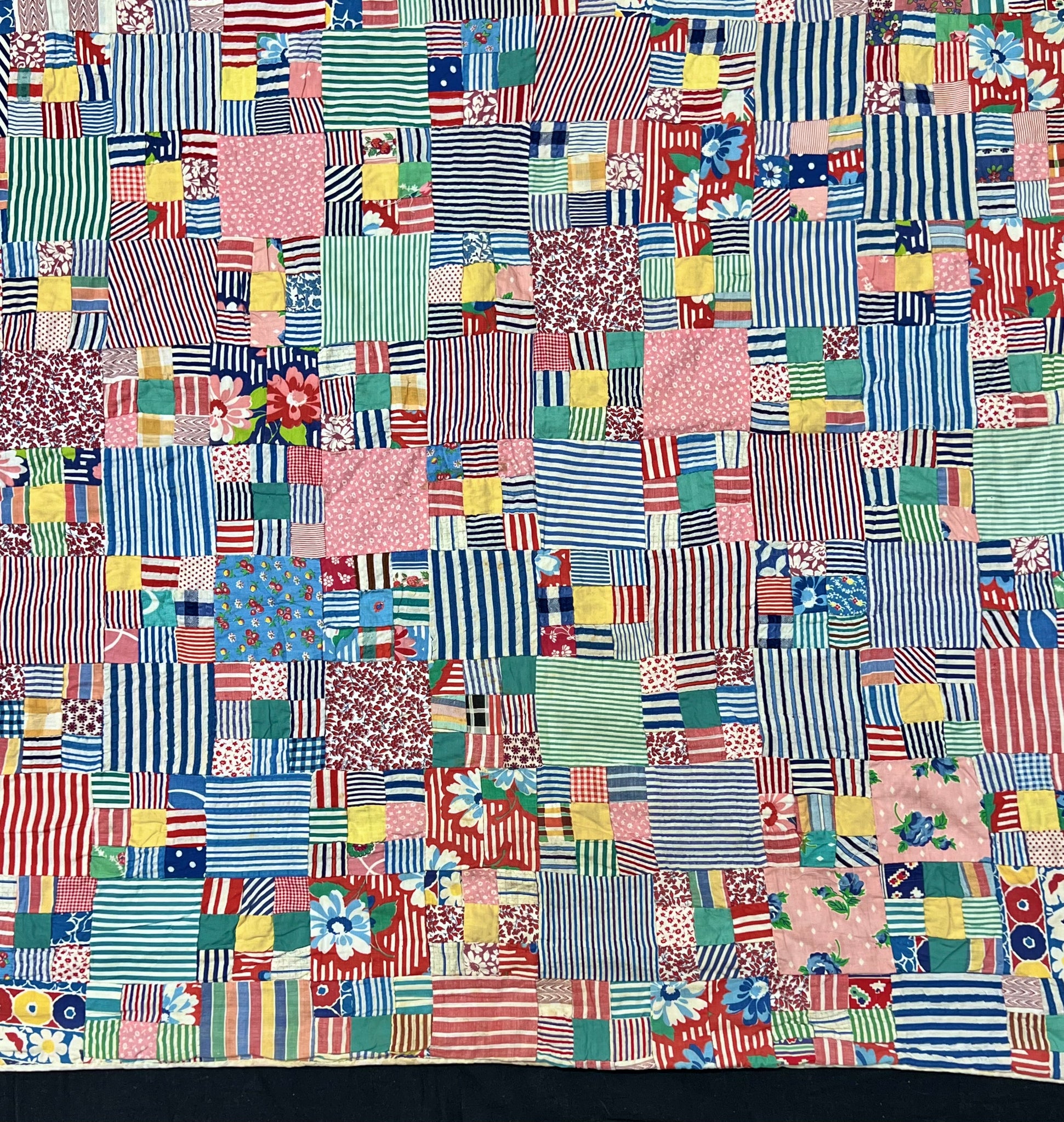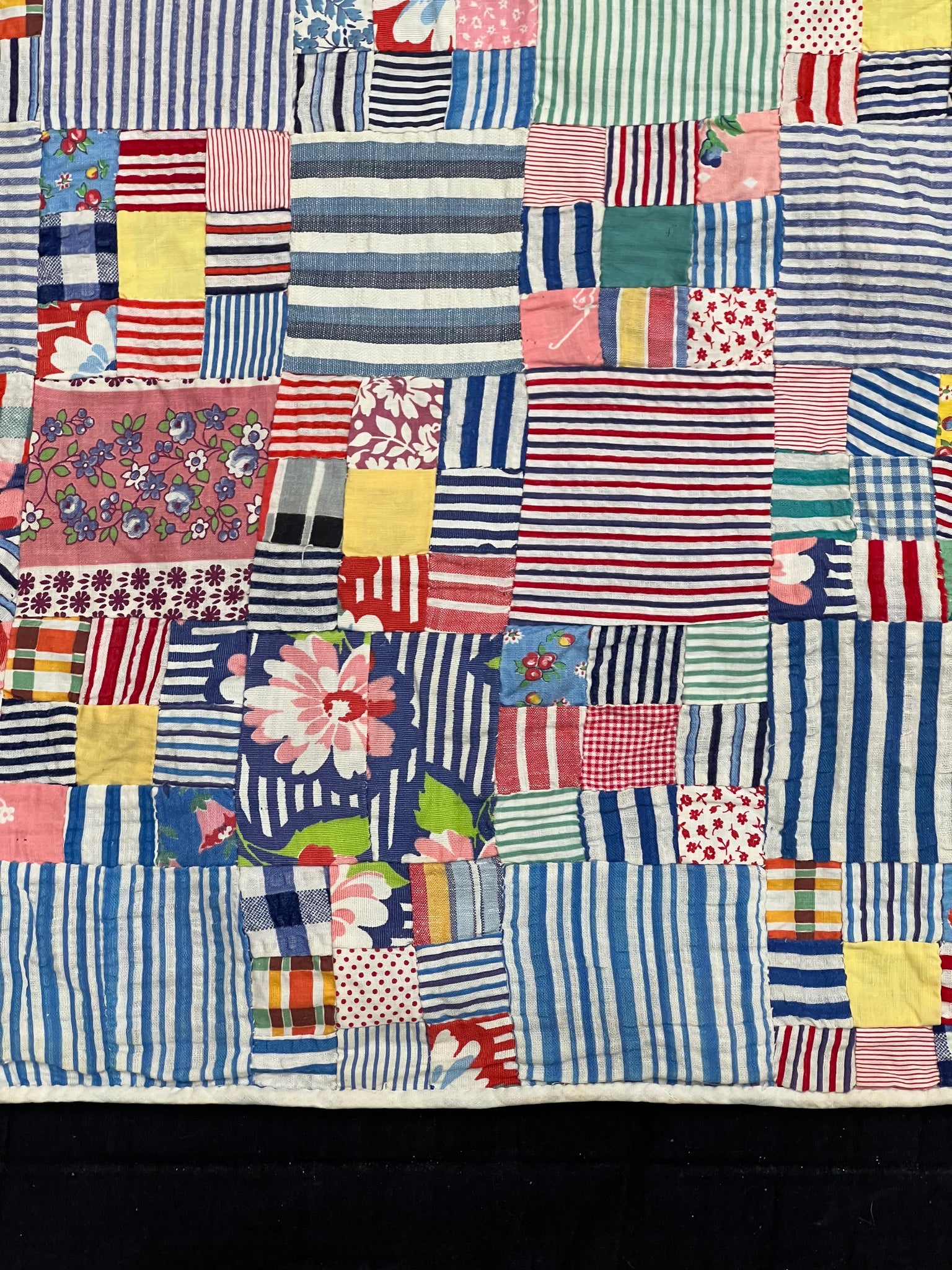 A lively quilt with fun designs on both sides. This 1940s Nine Patch-Hourglass quilt should cheer up anyone, anywhere. Bring in some light!