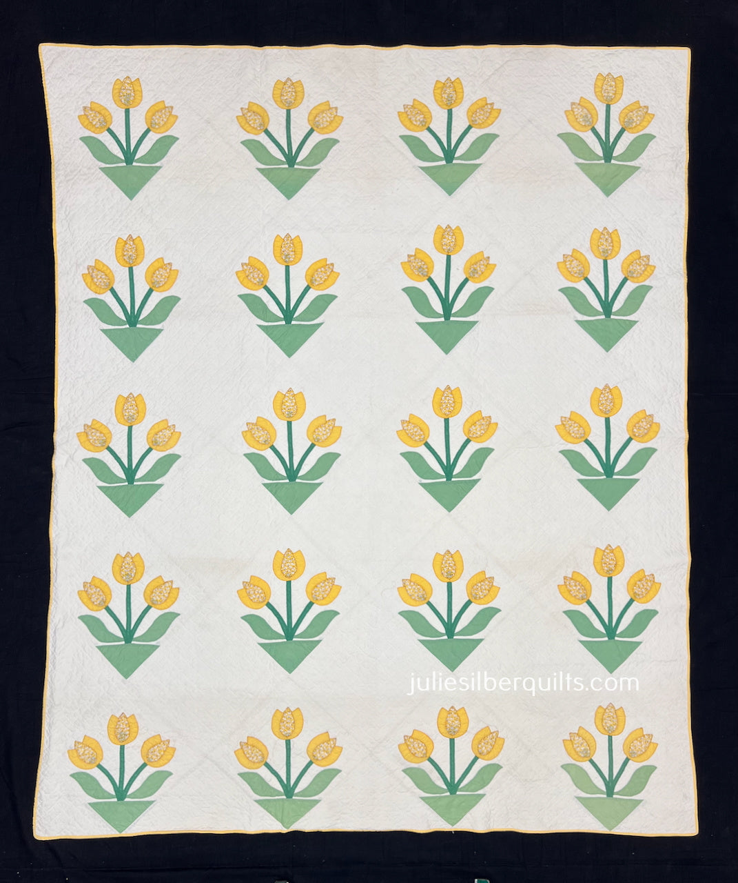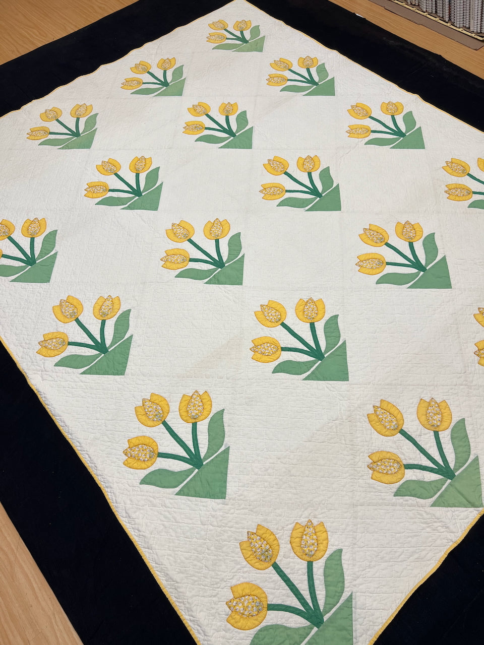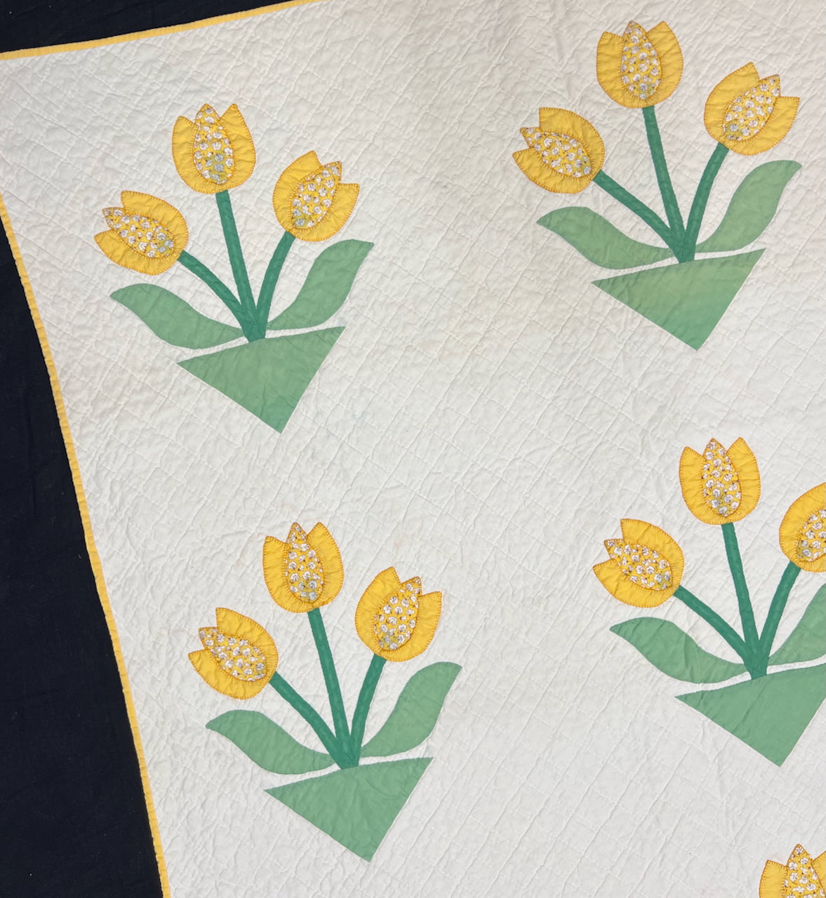 Circa 1930 Tulips quilt ~ a sweetheart in Excellent Condition. Thin and lightweight with no noted issues. A separately applied beautiful yellow binding.