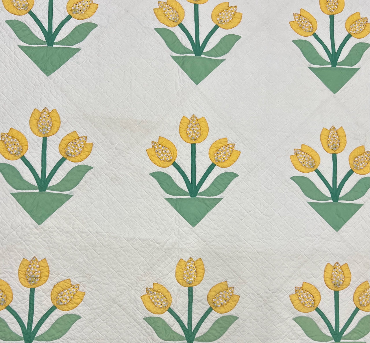 I love the printed floral cotton she chose for the center of her pretty tulips. Hand quilted in nice, even stitches.
