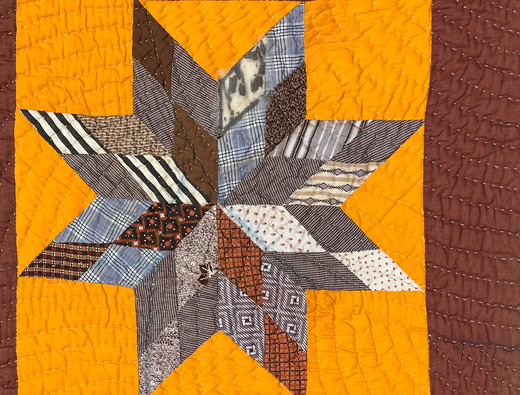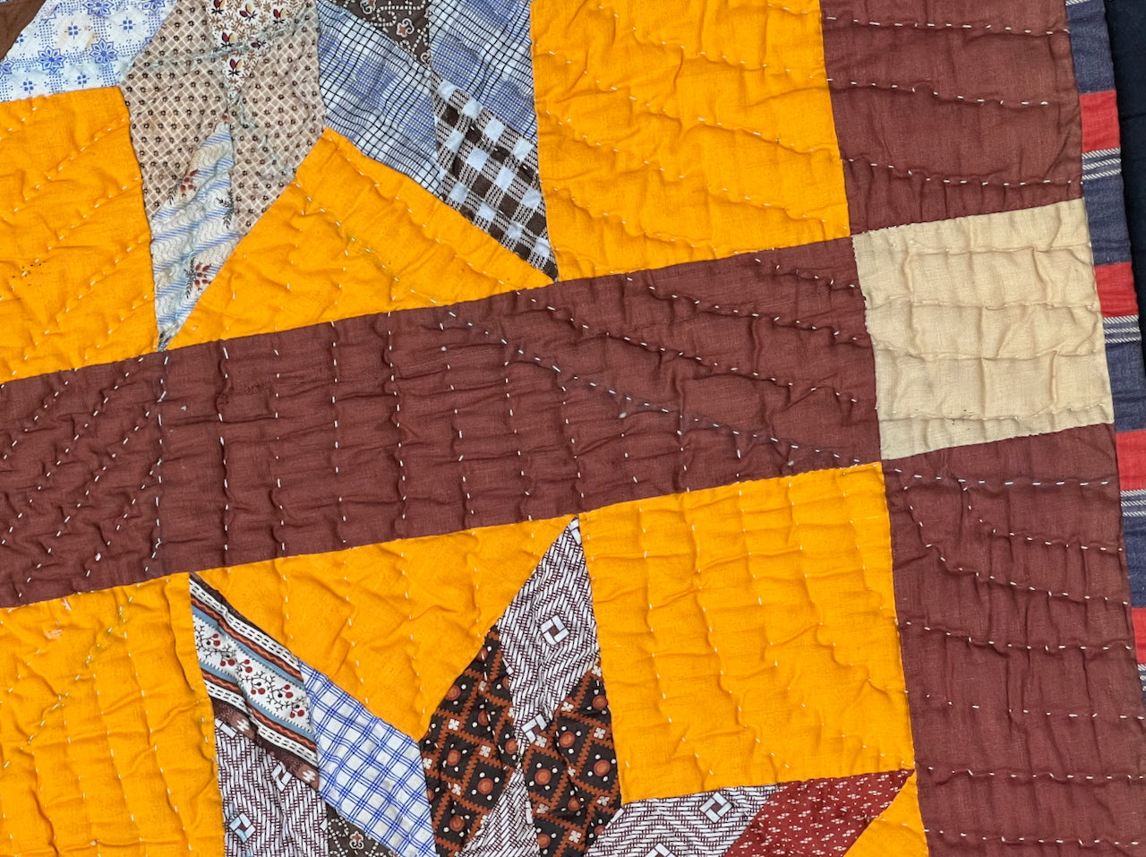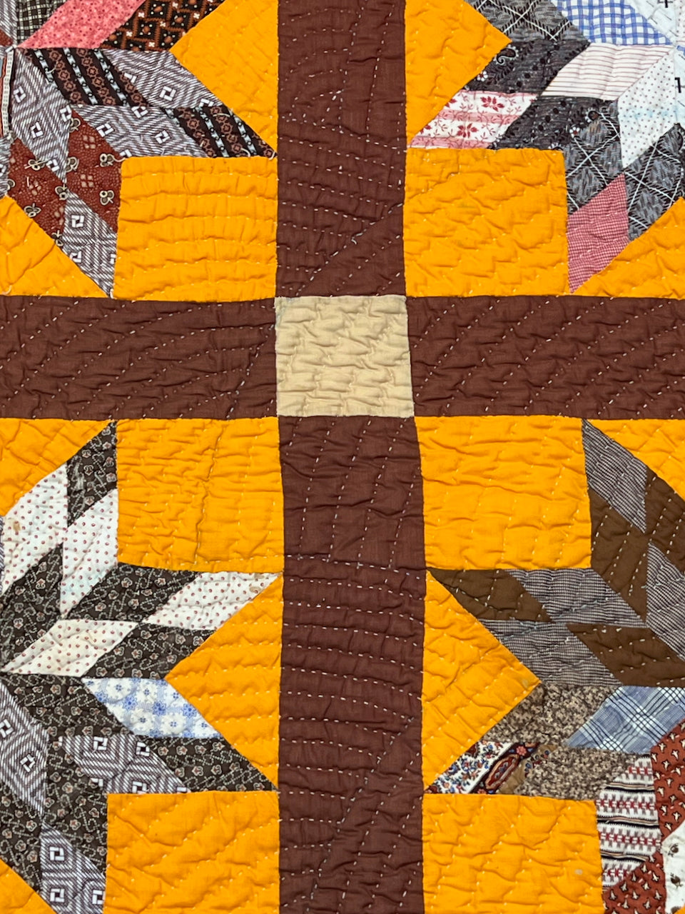 With a winning combo of madder prints and a solid cheddar, this is hand quilted in the style called "Baptist Fan," "Clamshell," or "Elbow Quilting."