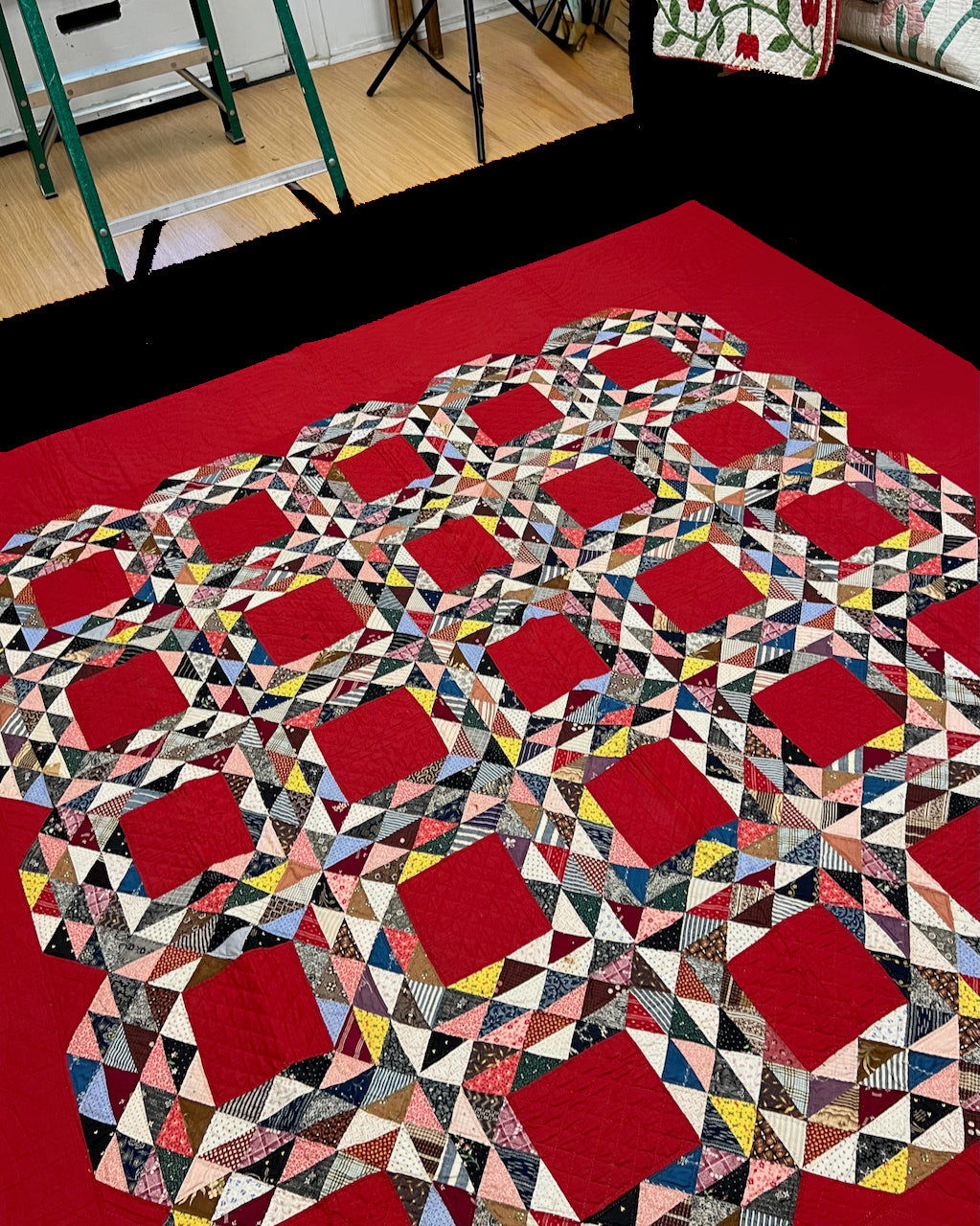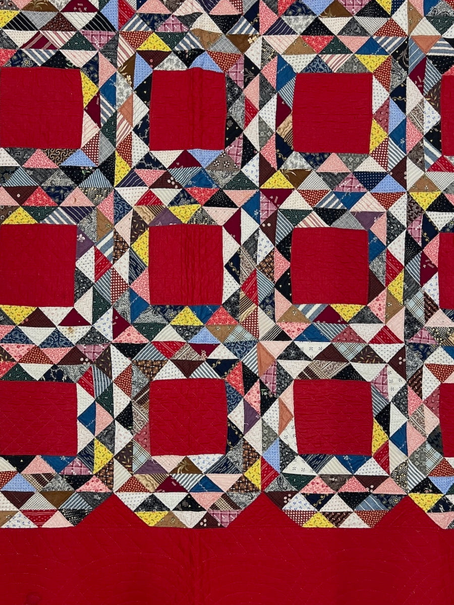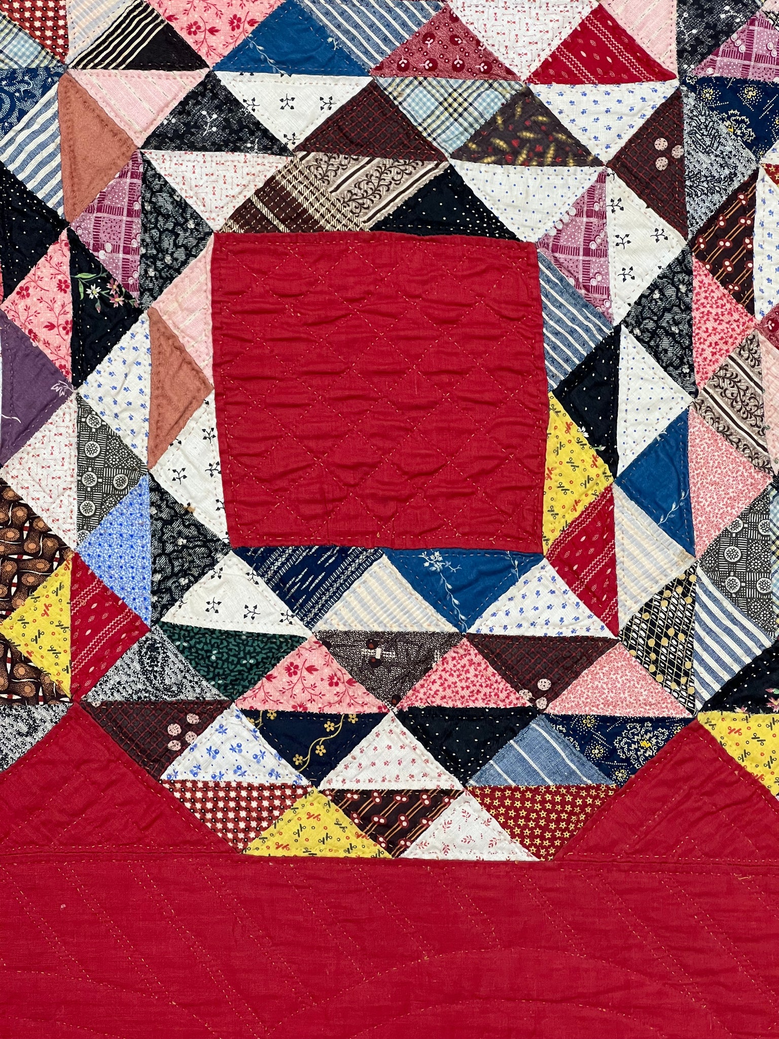 The maker did very accurate piecing; s/he placed the colored triangles in a pleasing, balanced arrangement. Hand quilted throughout with fine, even stitches.  She did crosshatch quitting throughout, and added softly curving cables in the wide red border.